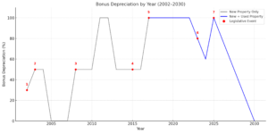 - 2002 Job Creation and Worker Assistance Act: Introduced 30% bonus depreciation for new property.